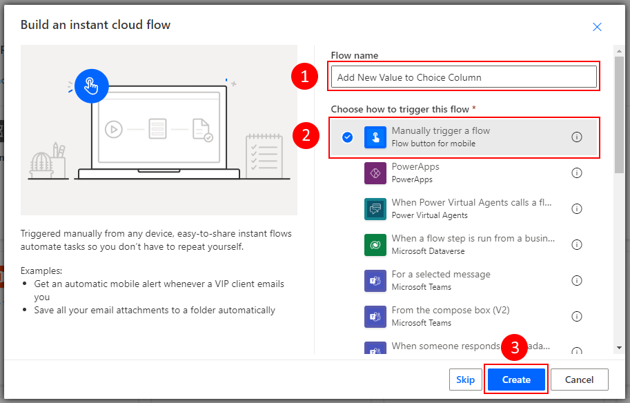 1. In the Build an instant cloud flow screen, enter the name of your flow, select the Manually trigger a flow trigger, and then click on Create.