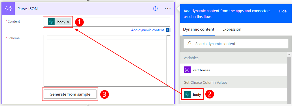 1. Click on Edit on the top right and then click on + New step. Then search for and select Parse JSON. Set the Content to the body output from the Get Choice Column Values action. Then for the Schema, click on Generate from sample and then paste the output you copied from the body of the Get Choice Column Values action. Click on Done.