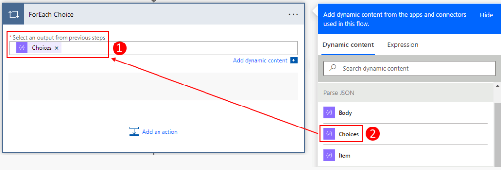 1. Click on + New step. Then search for and select Apply to each and rename it to ForEach Choice. Set the Select an output from previous steps to the Choices property from the Parse JSON action in the Dynamic content window.
