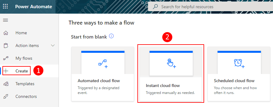 2. On the left menu, click on Create and then click on Instant cloud flow.